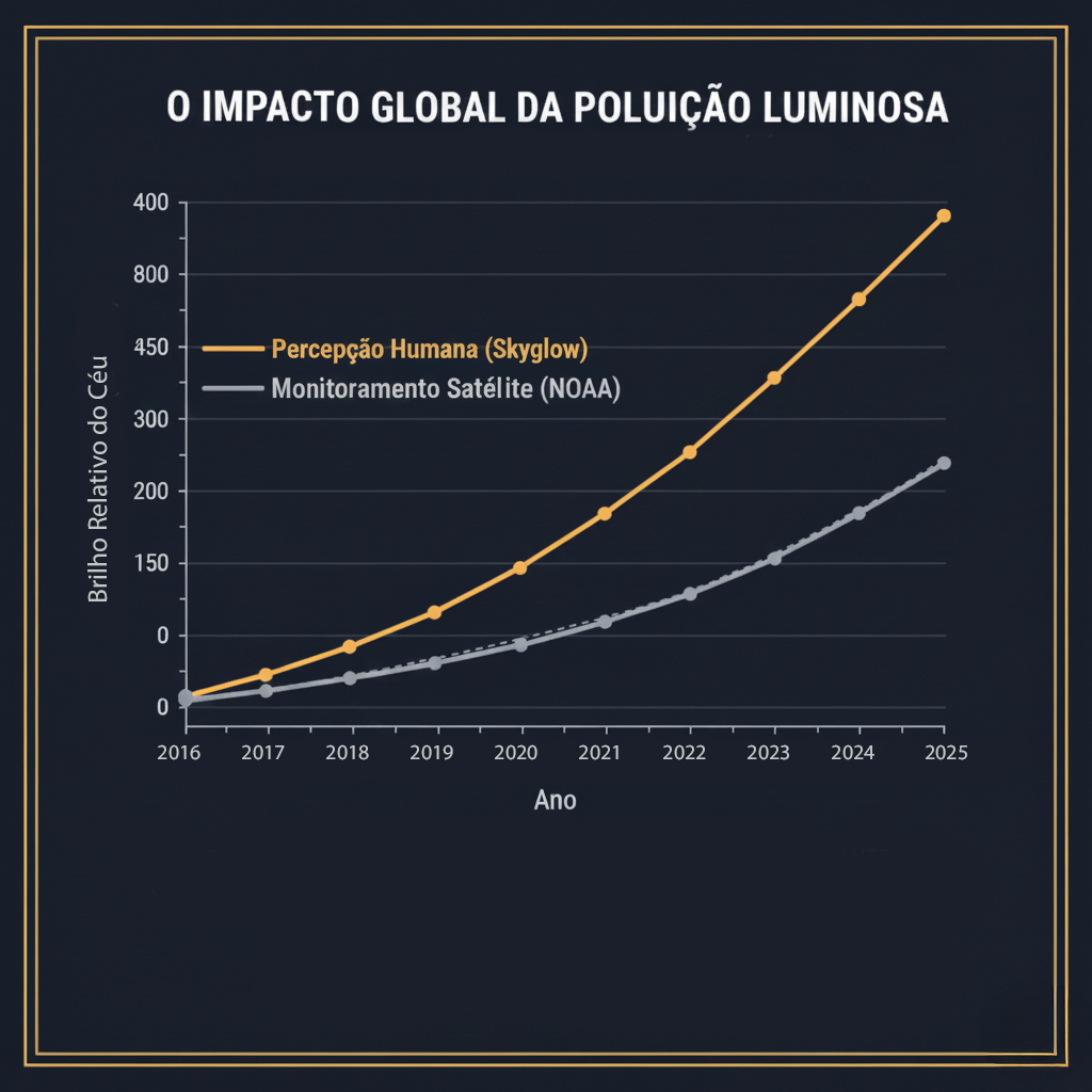 Enquanto o monitoramento via satélite parece estável, a percepção humana do brilho do céu cresce quase 10% ao ano, revelando a urgência de preservarmos os céus escuros.